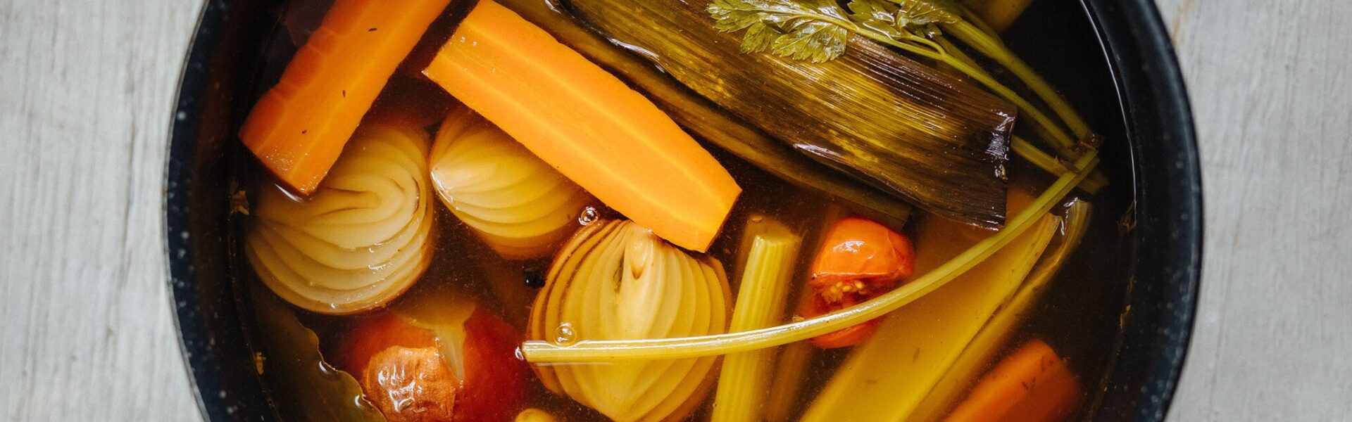 Mięso tworzy podstawę, ale to warzywa nadają rosołowi charakter. Marchew wprowadza słodycz, pietruszka – lekko korzenną nutę, seler – głębię, a por – subtelną ostrość. Nie może zabraknąć też cebuli, najlepiej przekrojonej na pół i opalonej nad ogniem. To właśnie ona odpowiada za ten niepowtarzalny, karmelowy posmak i złocistą barwę.